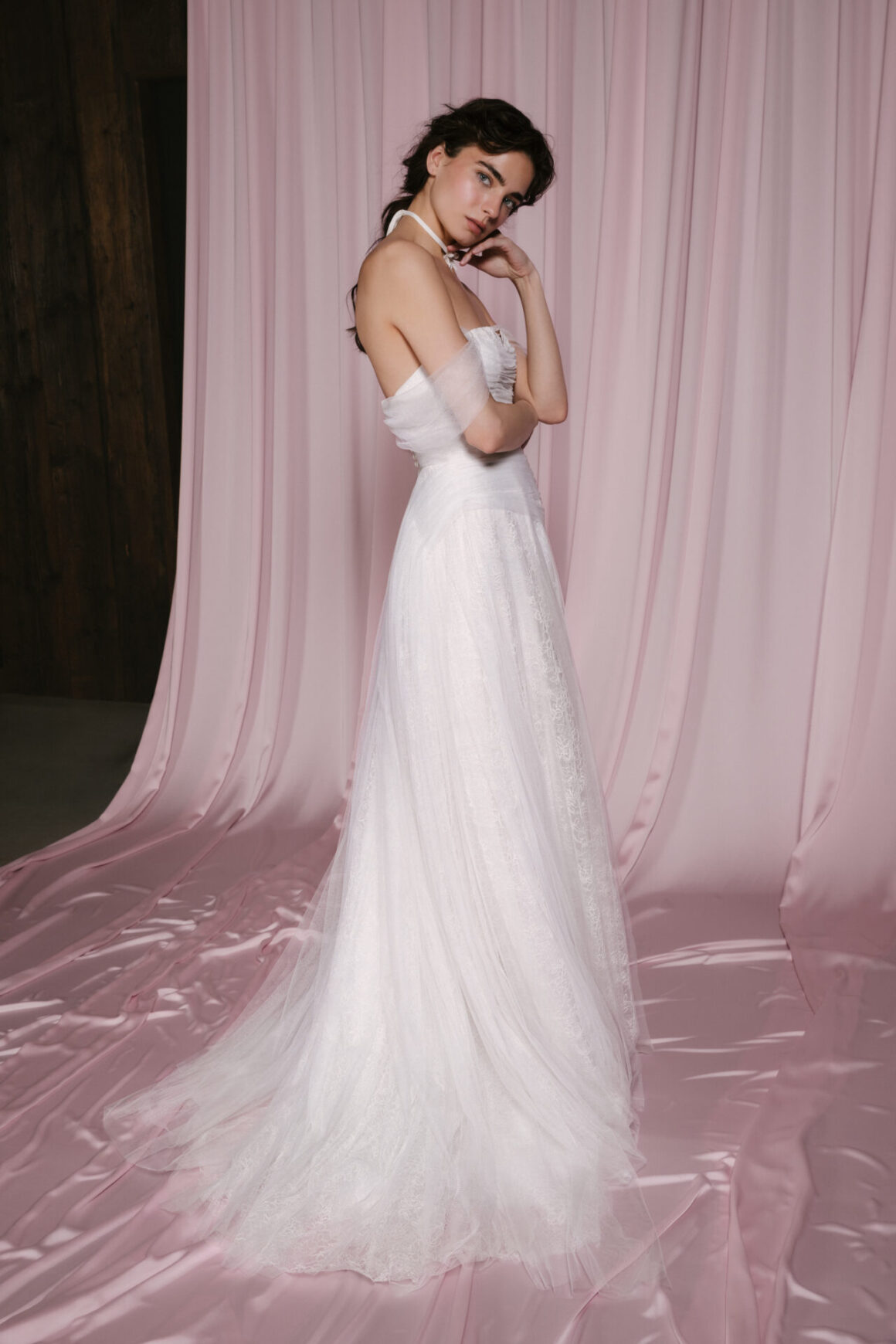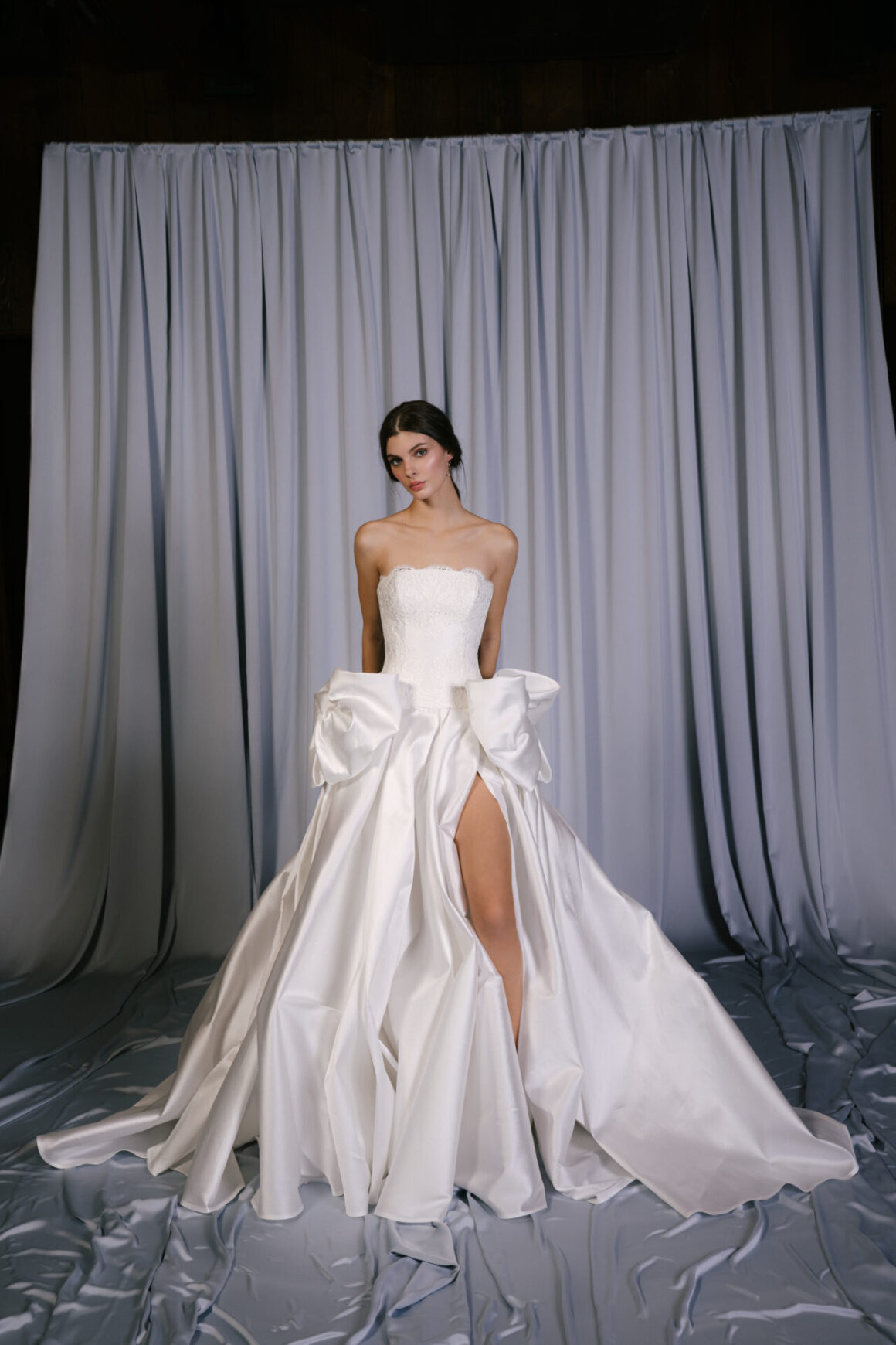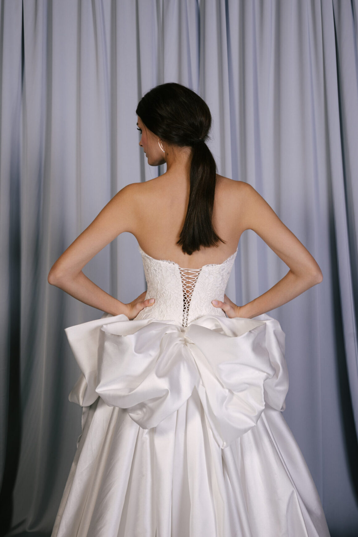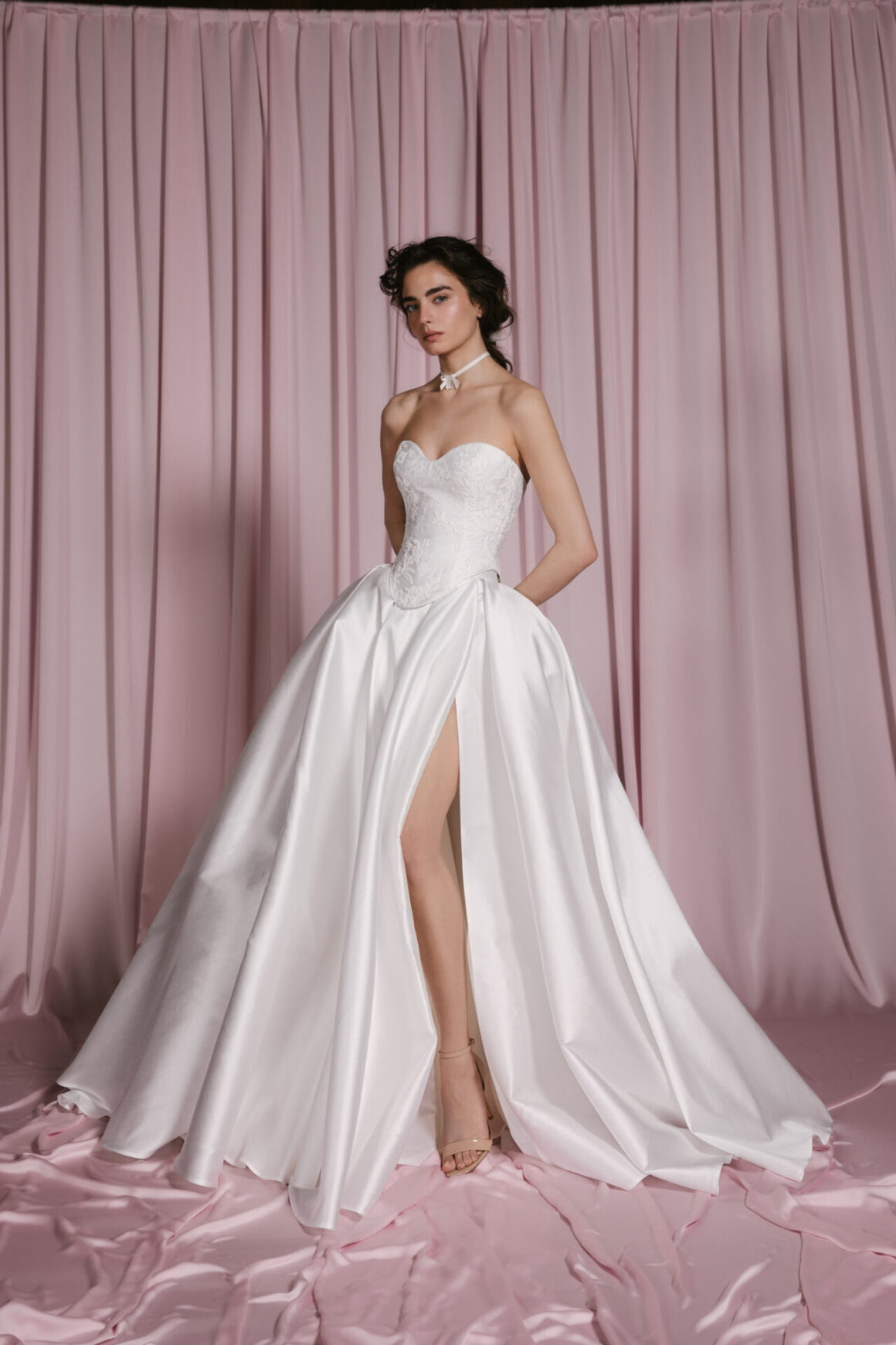 Another distinctive feature of the collection is that each gown has been given its own name, further reinforcing the sense of character and personal connection between the dress and its wearer. Many of these names were inspired by the aristocratic atmosphere of the world of Bridgerton, lending the collection an additional layer of narrative refinement.