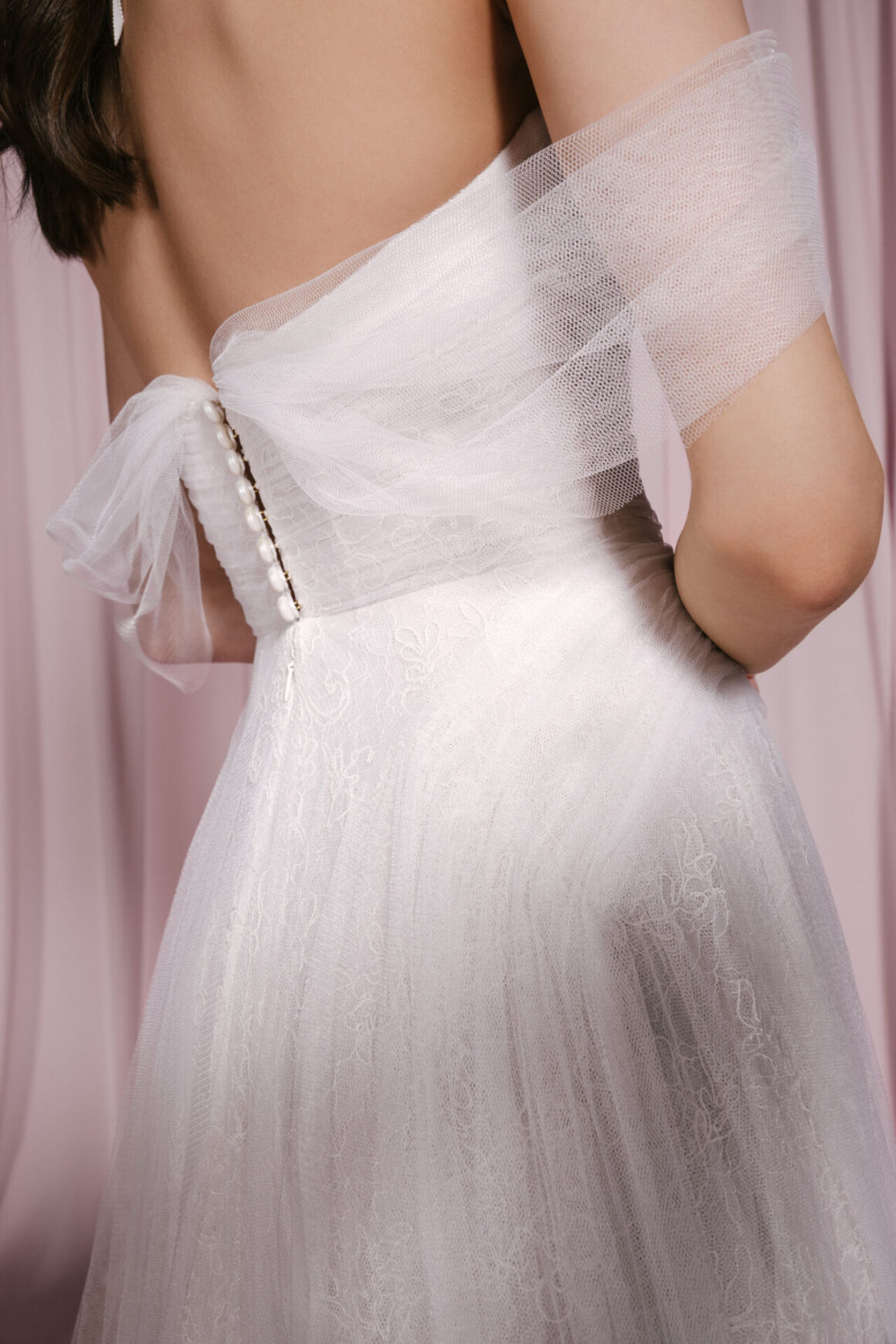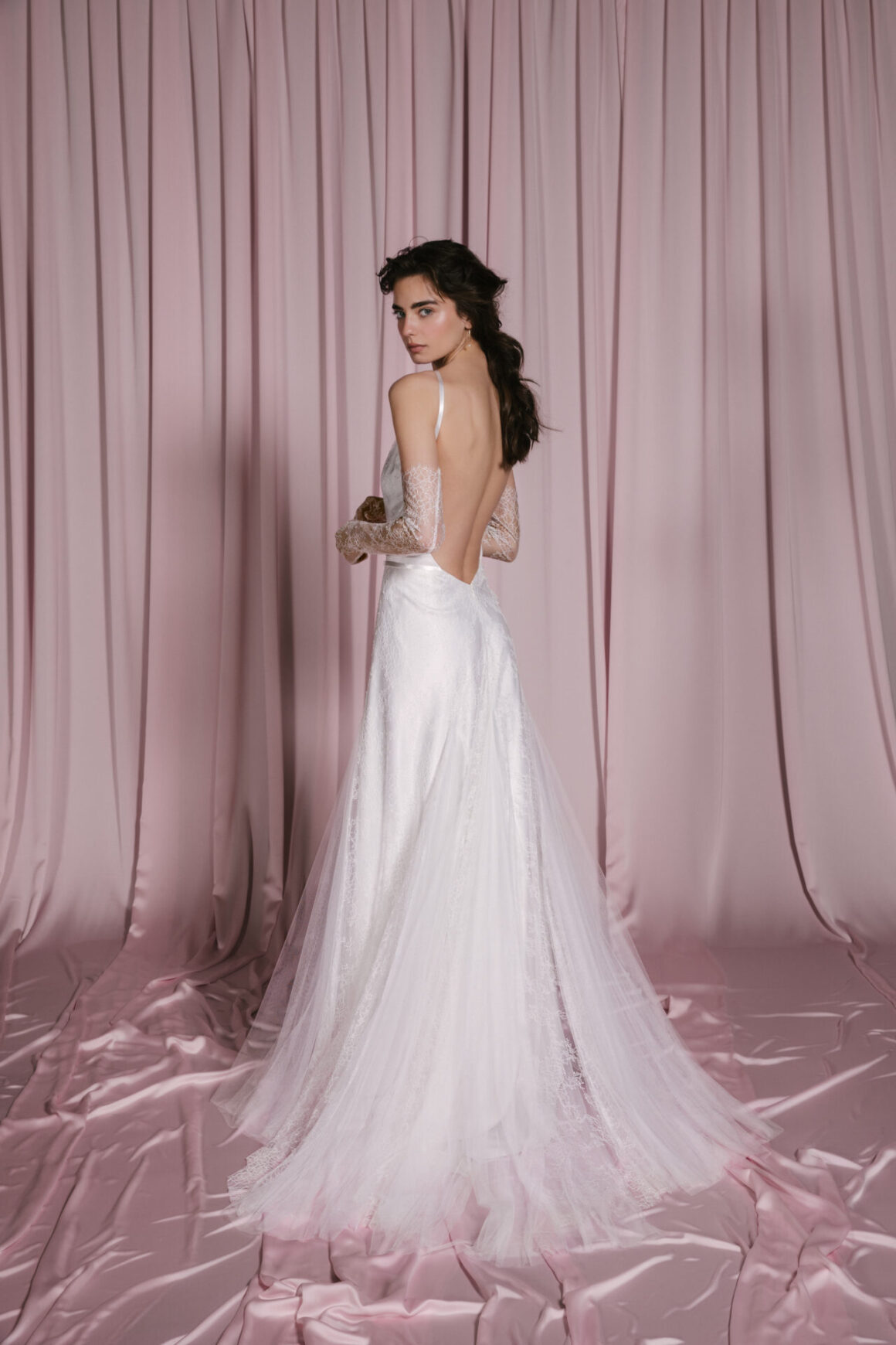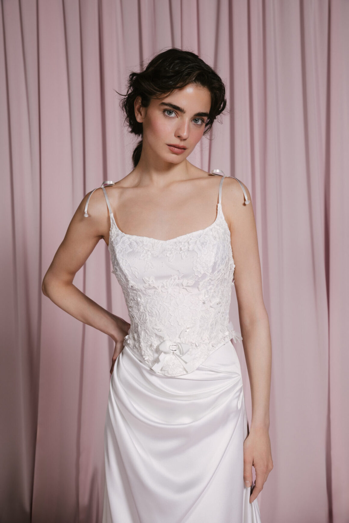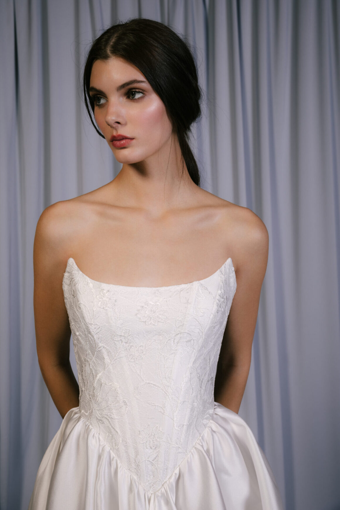 One of the defining ideas behind the collection is personalisation. For Daalarna, a wedding dress is never a finished object in itself, but the result of a shared creative process in which the bride takes an active role. Interchangeable elements, transformable details, and thoughtfully layered accessories allow each look to become entirely individual. With the addition of a different accessory or overskirt, a gown can be reimagined into a new silhouette altogether — perfect as a party dress, a ‘menyecske dress’or a piece that can continue to be worn long after the wedding day.